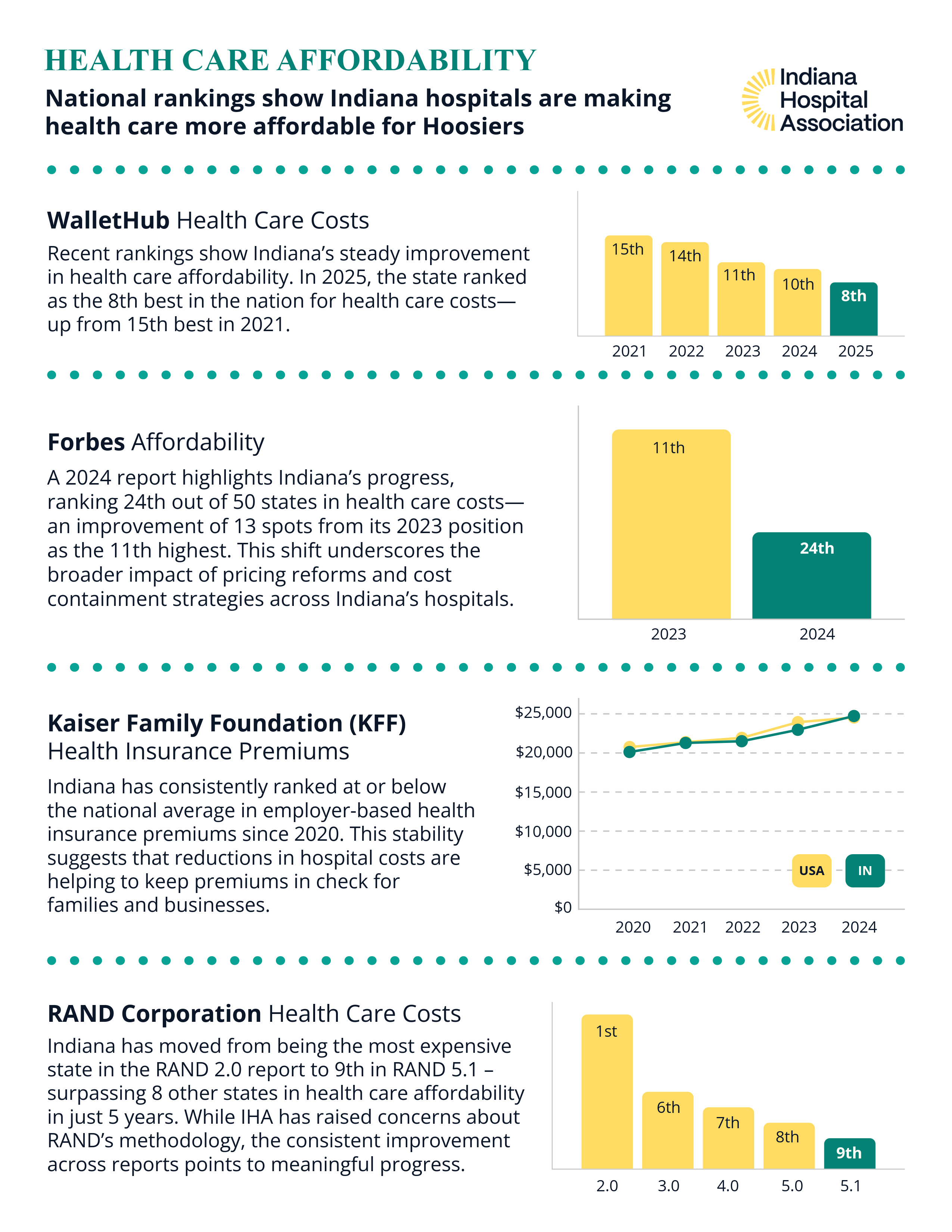 A 2024 Forbes report also highlights Indiana’s progress, ranking the state 24th out of 50 in health care costs—an improvement of 13 spots from its 2023 position as the 11th highest cost state. This shift underscores the broader impact of pricing reforms and cost containment strategies across Indiana’s hospitals.